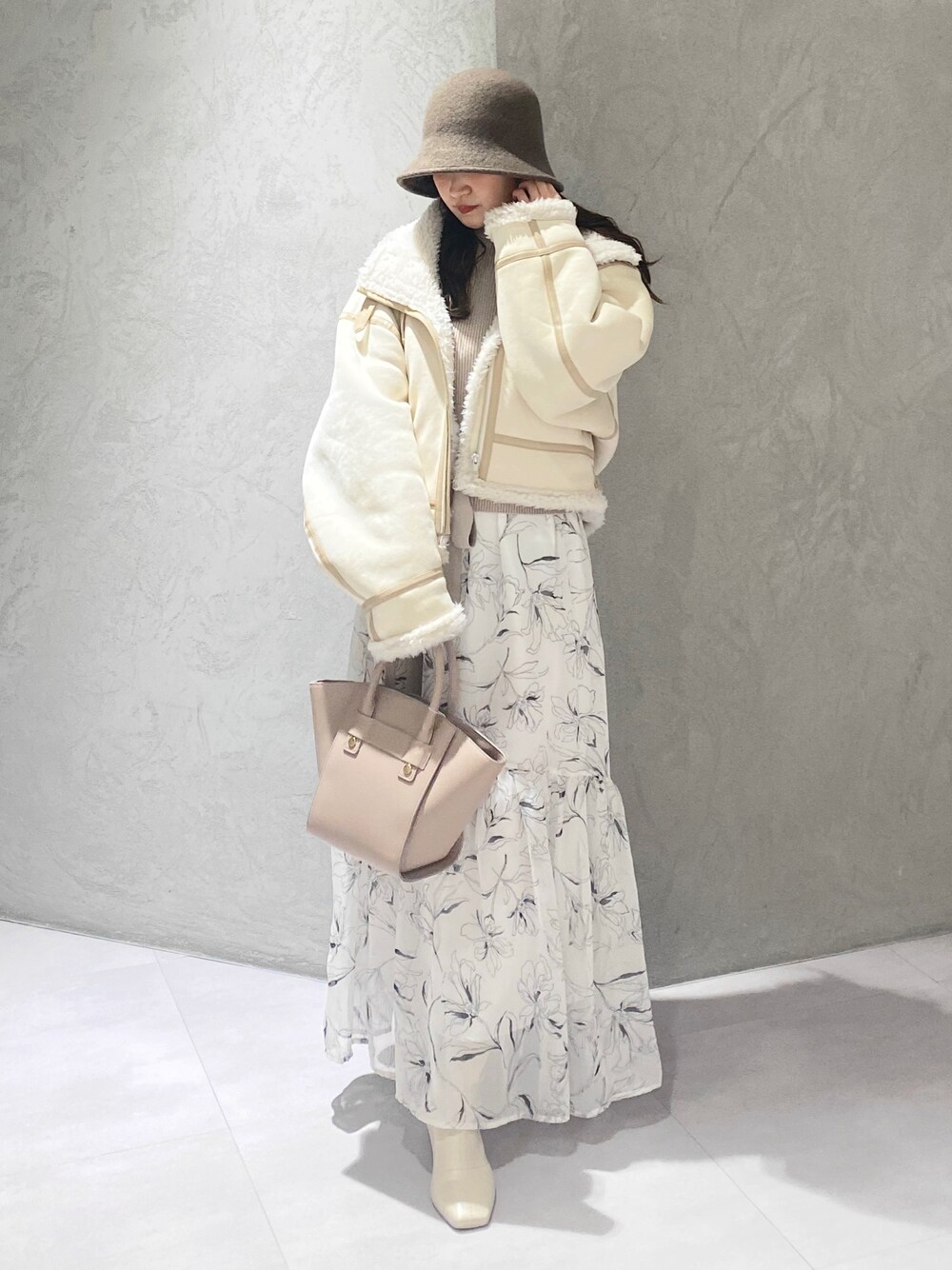 お上品🤍大人可愛いcode 【アウター】愛されふわふわムートンジャケット🤍裏地がふわふわとしていて、軽くてとっても暖かいです!ショート丈なので、スタイルアップ効果も抜群。低身長さんにもおすすめなアウターです✨ 【ワンピース】1枚で決まる!おしゃれワンピース👗ニットの部分が、ペプラムのデザインなのでウエストがきゅっと絞られたように魅せてくれます♡リボンを巻くとよりすっきり見えるのでおすすめです◎ さりげなく、お袖がパフスリーブになっていて大人っぽさもありつつ、可愛いらしさも詰まった大人可愛いワンピース♡スカートは、ふわっと広がるデザインがロマンティックでとっても素敵です✨ 【ハット】ウール100%で暖かく、被るだけでコーデが一気におしゃれにみえるウールバケットハット♡この冬一推し!のハットです! 【シューズ】かかとのクリアが、可愛いブーツ👢足裏がふかふかしていて店頭で長時間履いていても、痛くならない神ブーツです!!スタッフのリアルバイ率が1番高いです✨