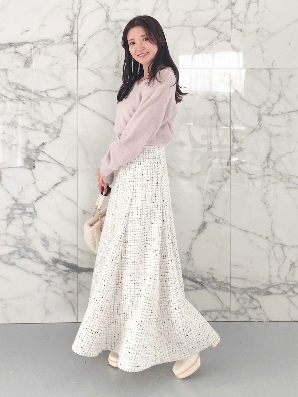 大人フェミニンコーデ🤍 【トップス】あの大人気シリーズ、シャギーニットのnewデザインです💓ネックレスがセットになったシンプルでも、ふわふわ可愛いらしいニット♡ボトムスがハイウエストですと、トップスを、インとアウトどちらもバランス良く着れるのでおすすめです。 【スカート】シーズンムード高まるおしゃれなツイードのロングスカート🤍 肉厚で生地がしっかりしているので暖かさもあり真冬にも大活躍する事間違いなし!のスカートです✨後ろのリボンでウエスト調整出来るので、とても履きやすいです!!