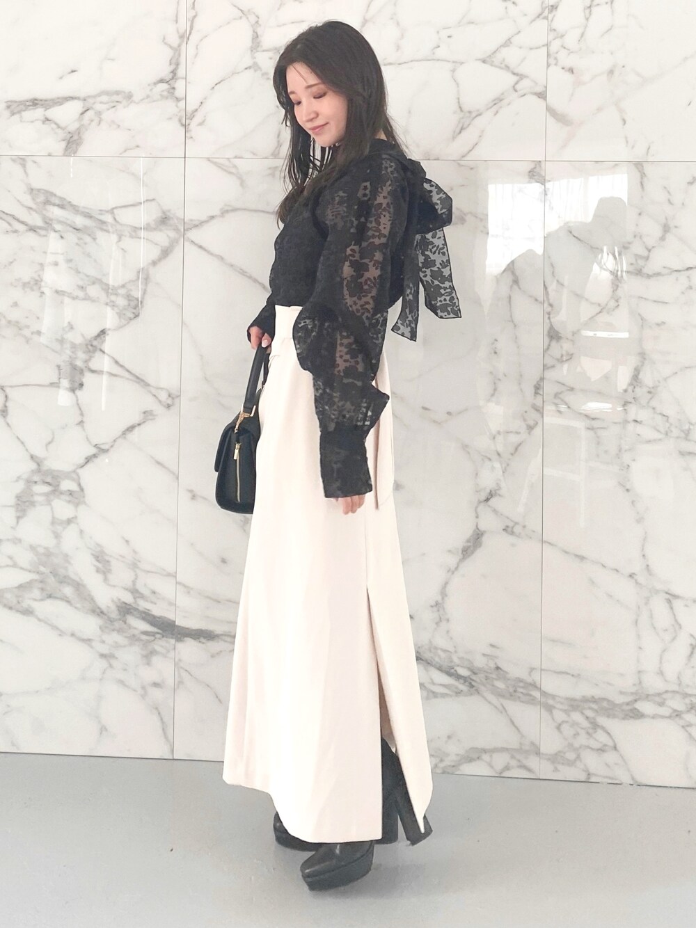 お出かけ綺麗目コーデ🤍 【ブラウス】 前後2wayで着用頂けるブラウス。さらっと肌が透けてみえるのでブラックでも重たくなりすぎず、春先にもばっちりです♡!! 【スカート】ハイウエスト効果で、足が長くみえスタイルアップ効果抜群!ウエストゴムで伸縮性がありタイトなスカートですが履きやすいです。オフィスカジュアルにもおすすめです✨