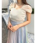キラキラトップス✖️マーメイドスカート✨ ※Instagram (@mercuryduo_nayuu)リール詳細!〈低身長スタッフが着る おすすめフェミニン3コーデ〉 新しい新作のキラキラトップス、お袖のスパンコールがお顔を明るく華やかに魅せてくれる一枚です♡落ち感があるパフスリーブなので肩幅が大きくみえることもないのでおすすめです⭐︎ 合わせている、マーメイドスカートはハイウエスト切替なので低身長の私でもスタイルアップが叶いました✨ウエストのリボンでサイズ調整出来るので、お食事の日にもぴったり♪