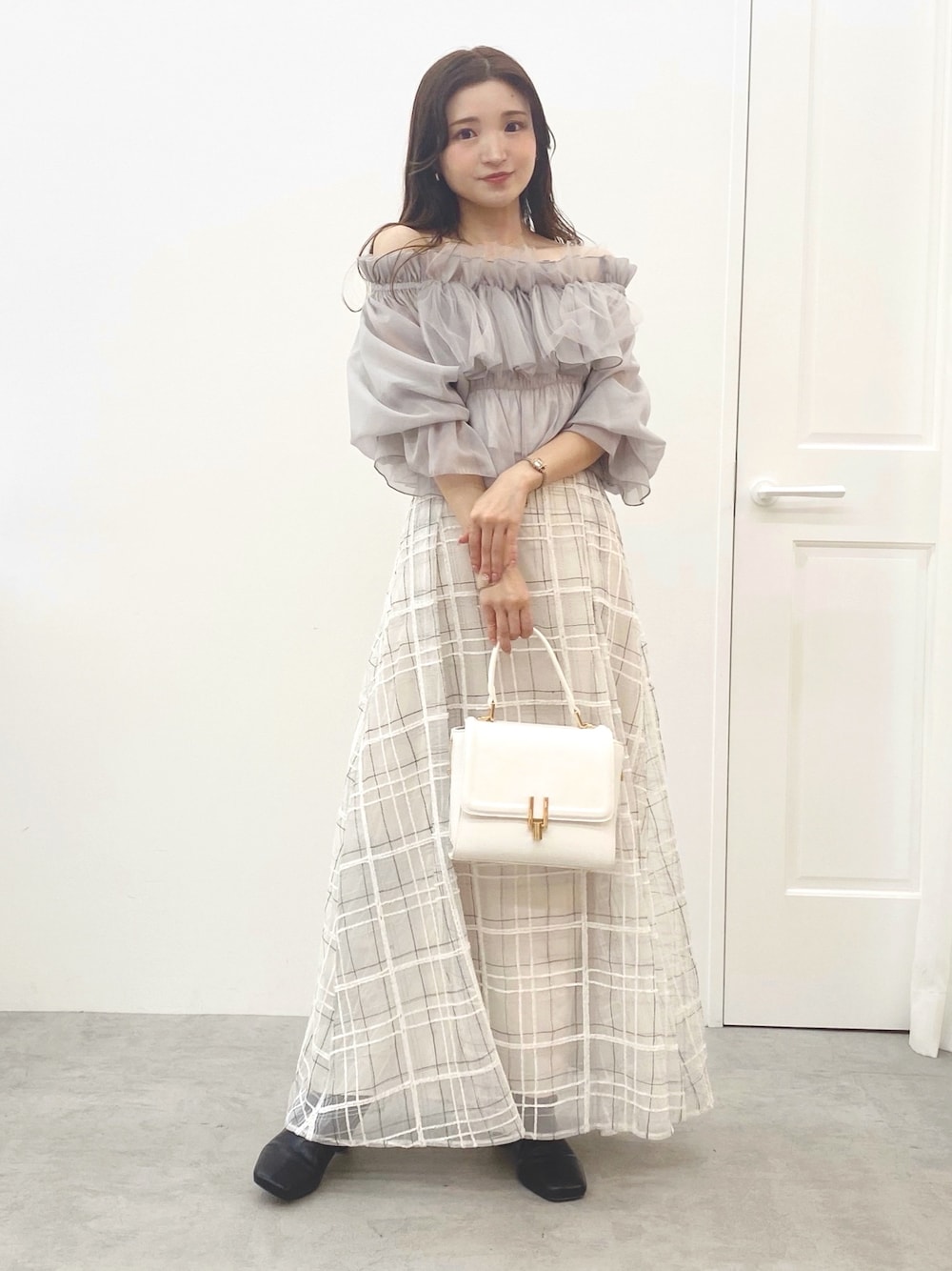 綺麗目デートコーデ🤍 程よいフレアシルエットが大人可愛いスカートに、今から着られて秋まで使えるブラウスのコーデです♡ハイウエストスカートなら短丈のブラウスでも、お腹が隠せるので安心ですよ✨ バックは可愛くホワイトに、足元は黒で引き締めた大人可愛いスタイルです!