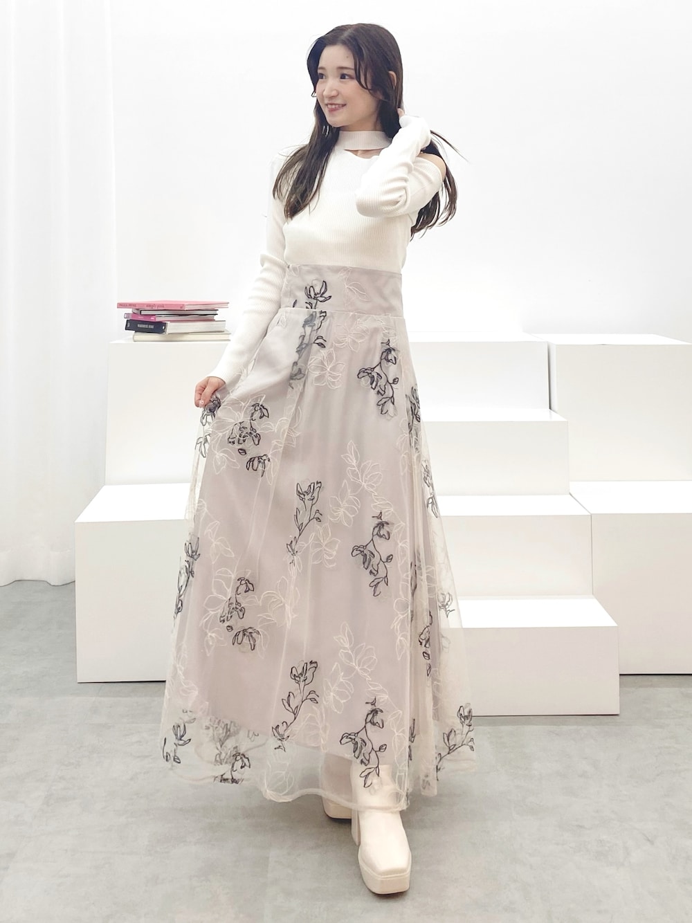 お上品code♡💐 【トップス】大人気ニットが、長袖になり入荷しました🤍程よい肌見せが大人可愛い一枚。 ボトムスは、スカートからカジュアルなデニム、どのボトムスにも合う万能ニットです✨ 【スカート】ハイウエスト切替でスタイルアップ効果抜群!フレアに広がりすぎないすっきりとしたシルエットなので、大人可愛く履ける花柄スカートです♡150cm Mサイズ、ヒールがあると安心です! 【ブーツ】 普段22.5cm 36サイズ 少し余裕があるので、分厚い靴下などをおすすめします! ヒールが太めで安定感があり歩きやすいです!
