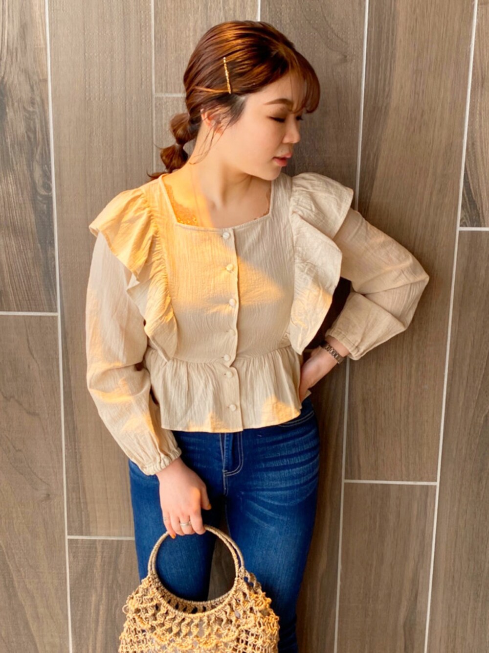 大きめのフリルがポイントのブラウス。サラッとした生地が春らしく、デニム合わせでカジュアルなお出かけにもピッタリ。