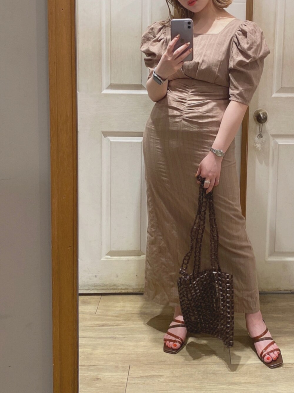 【ワンピース】コットン素材の夏にぴったり涼しげワンピース。パワショルダーやお腹部分のさりげないギャザーがポイントなのはもちろん、こちらのワンピースはバックデザインが一番のポイントです!今年のトレンドである肌見せデザインで、タイトシルエットと合間って女性らしさが満点なワンピースです❤︎※着用はサンプル品の為、実際の商品は背中の開きがもう少し抑えめになっております。 【シューズ】今年もクリアサンダルが遂に出ました!!履きやすさ・お洒落さ・合わせ易さ、全て完璧なこちらのサンダルは、4色とも雰囲気が変わるので2色買いもおすすめです!大人っぽく見せたい方はこちらのブラウンがシックな印象になります❤︎