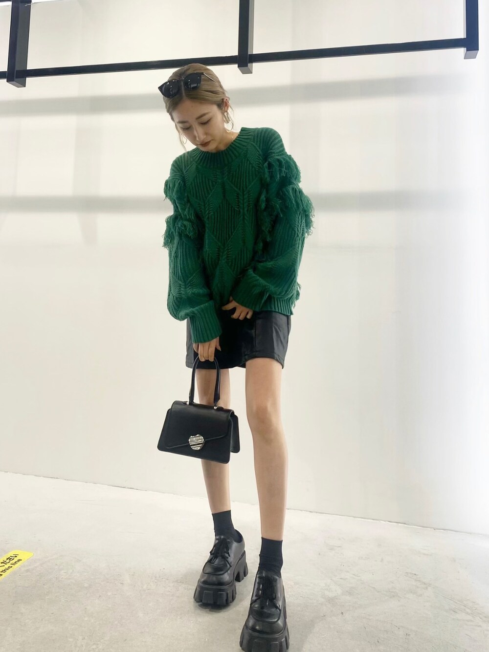 低身長さんにオススメなワンピレイヤードコーデ❤︎ トレンドカラーのこちらのグリーンのニットは、カラーが鮮やかなので普段モノトーンが多い方は特に、一枚持っていると何にでも映えますし、フリンジデザインがオシャレさを増させてくれるオススメの商品です★★★ ゆるっとしたシュルエットでお尻が隠れる丈感なのが有難いですね。 厚手に見えますがアクリル100%のニットなので今時期方にぴったりで、アクリルなのでニット特有のチクチク感はなしです! また、レイヤードしているレザーのワンピースはアジャスターがついていて長さ調節できるのでご身長に合わせて調節できるのもオススメポイント。 154cmの低身長な私は1番短くして着用しました! ボリュームのあるシューズはヒールの高さがなくとも、スタイルアップ効果があるのでミニ丈には鉄板のスタイルです★ 店頭で8時間履いていても軽いし傾斜がなく楽ちんなのでプライベートでも重宝しています。 ワンピースの全貌やヒールの高さ等は商品ページからぜひ詳細ご確認ください!!