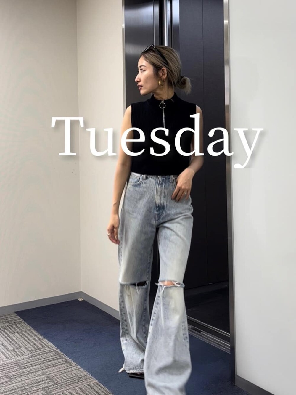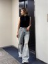 【カジュアルコーデ】 【トップス】・脇が隠れるボックス型なので上半身細見え効果◎・タンクトップだから夏でも◎・腕を出したくない方は下にTシャツを合わせても◎【デニム】・154cmSサイズ着用で膝上にクラッシュが来るおかげで足長効果◎・ポケット位置が高くヒップラインも綺麗に見える