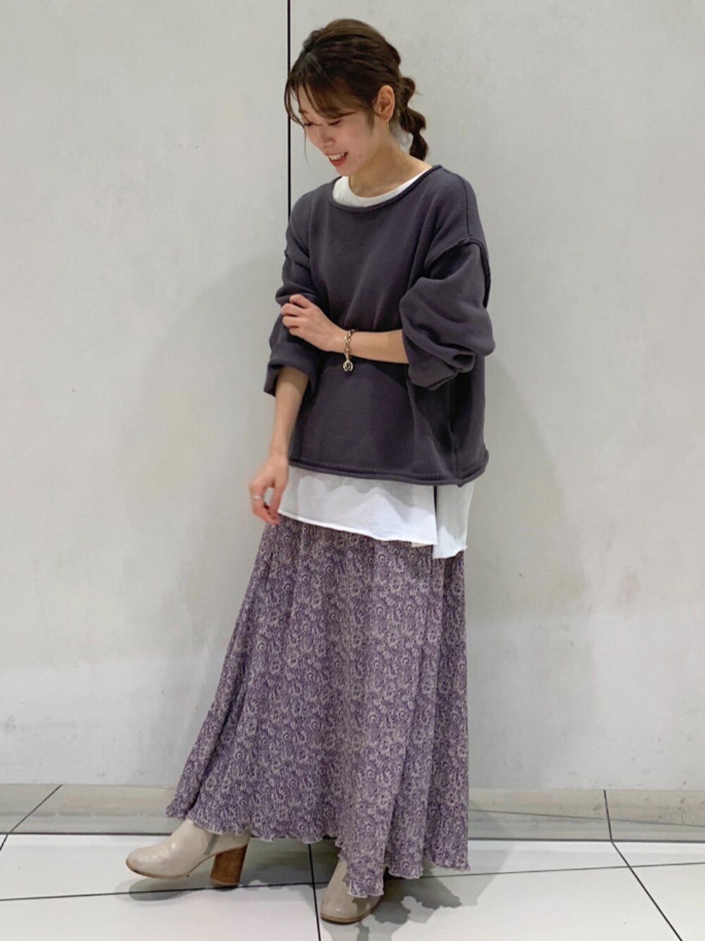 宮地玲奈(Ungrid)のスカート「フラワープリントランダムプリーツマキシスカート」を使ったコーディネート