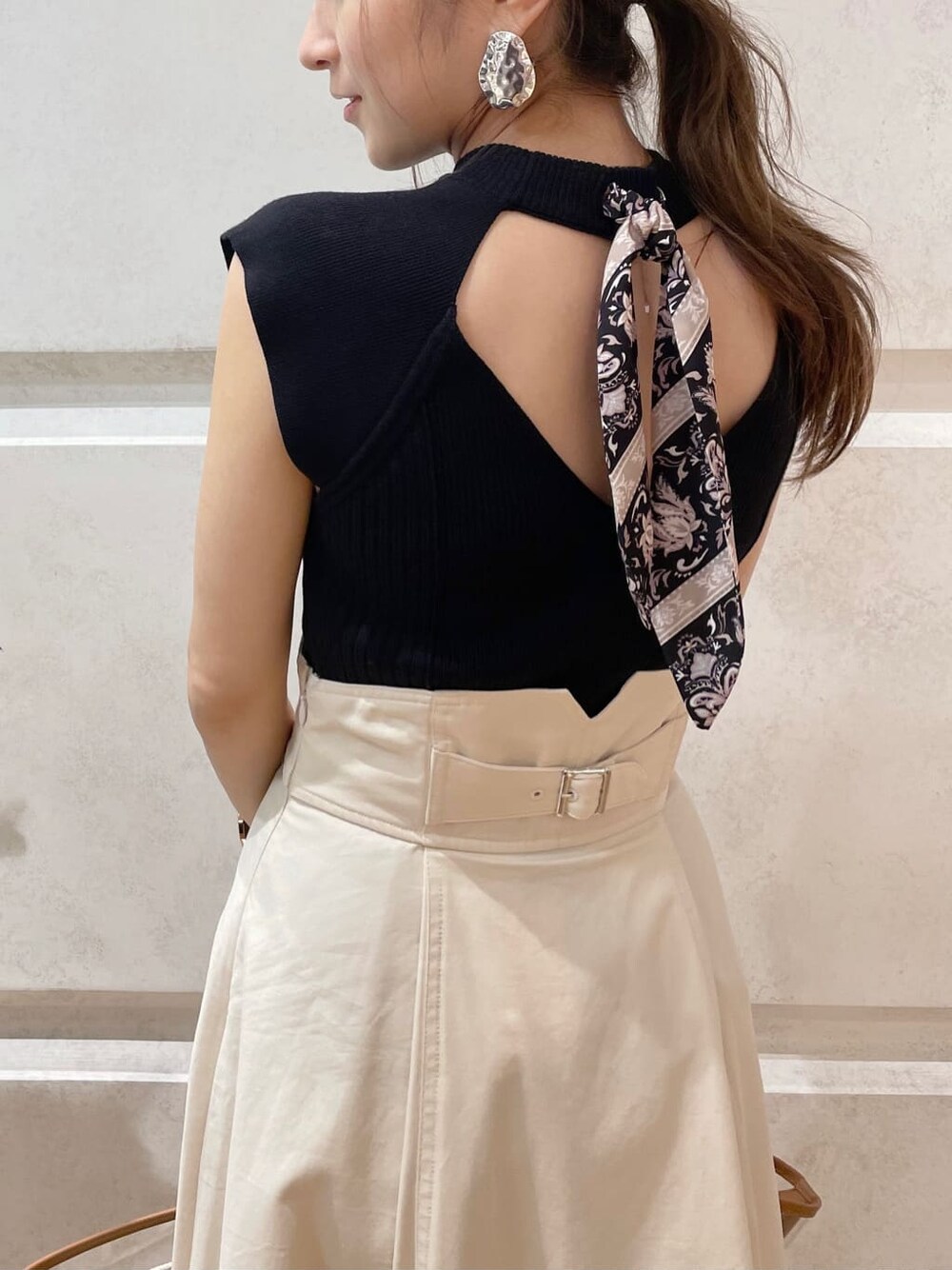 全店大人気!バックスタイルがおしゃれ可愛いニットを着てみました♡リブニット素材でも生地がしっかりしているので身体のラインが出すぎません!変形リブで伸縮性があり着心地抜群なのも嬉しいポイント◎背中の開きはインナーが見えないよう計算されておりセットのスカーフと合わせて着ていただければ露出を抑えられるので肌見せ得意じゃない方も挑戦しやすいです♡合わせているスカートはたっぷりとしたフレアがより女性らしくみせてくれウエストはコルセット風なのでスタイルも綺麗に見せてくれる万能アイテム♡可愛いけど大人っぽさもあるコーディネートにしてみました♡