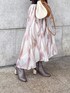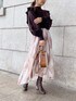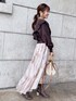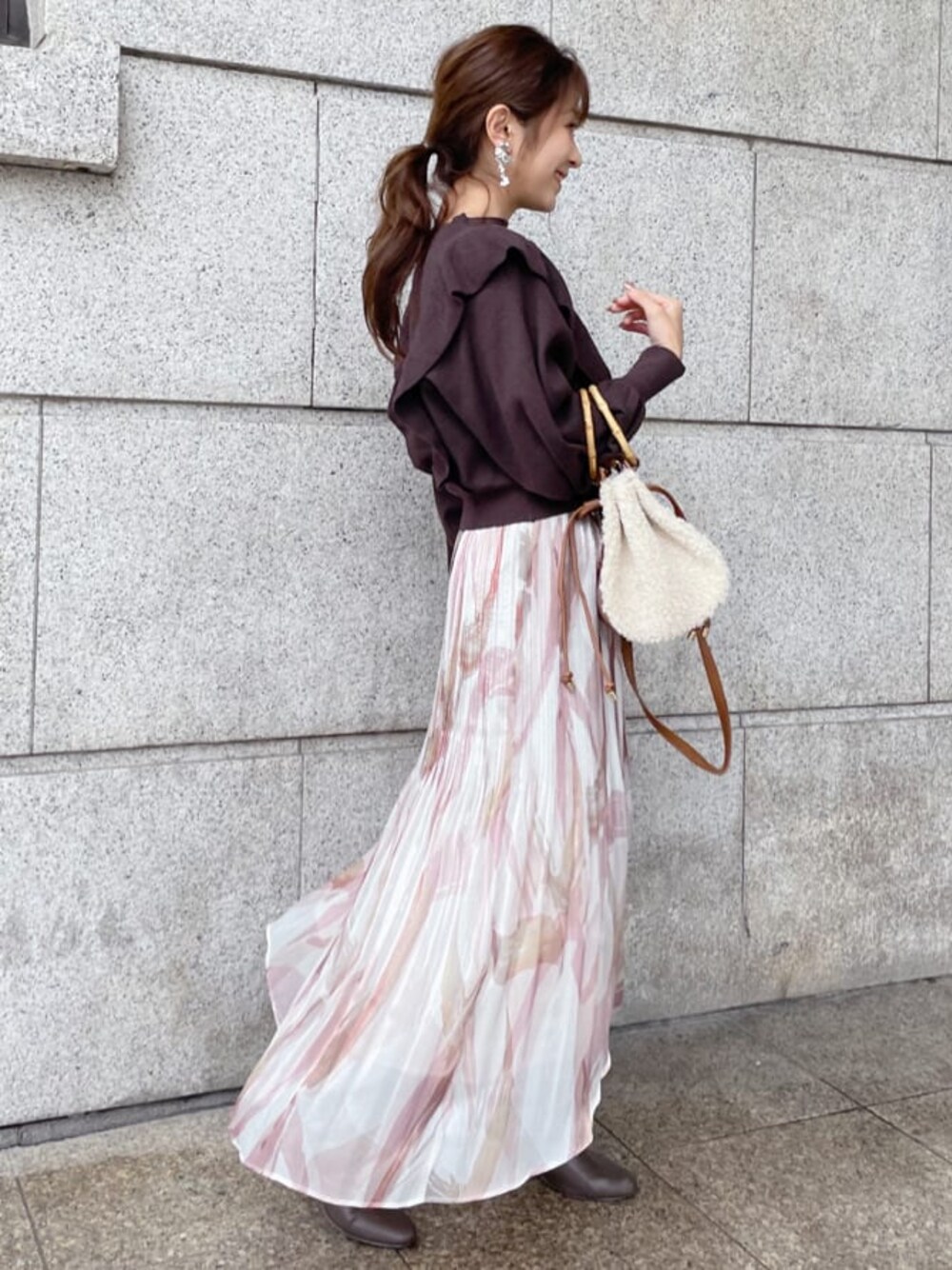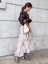 ブラウン×ピンクの暖色カラーが大人可愛いコーデにしてみました♡ニットはマーキュリー定番ラッフルシリーズ!ボリュームのある肩フリルもハイゲージ編みのニットなので肩周りは大きく見えすぎません!フリルの甘さとドルマンスリーブなのでちょっと緩い抜け感のある雰囲気で着ていただけます♡裾がリブになっているのでふわっとしたシルエットのスカートを合わせてもスッキリスタイルアップみえするのも嬉しいポイントです!スカートはシアー感があり動くたびにキラキラ華やかな一枚に…♡ダークカラーのニットを合わせて可愛さ抑えた大人フェミニンコーデはデートやお出かけにオススメです♡