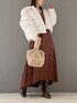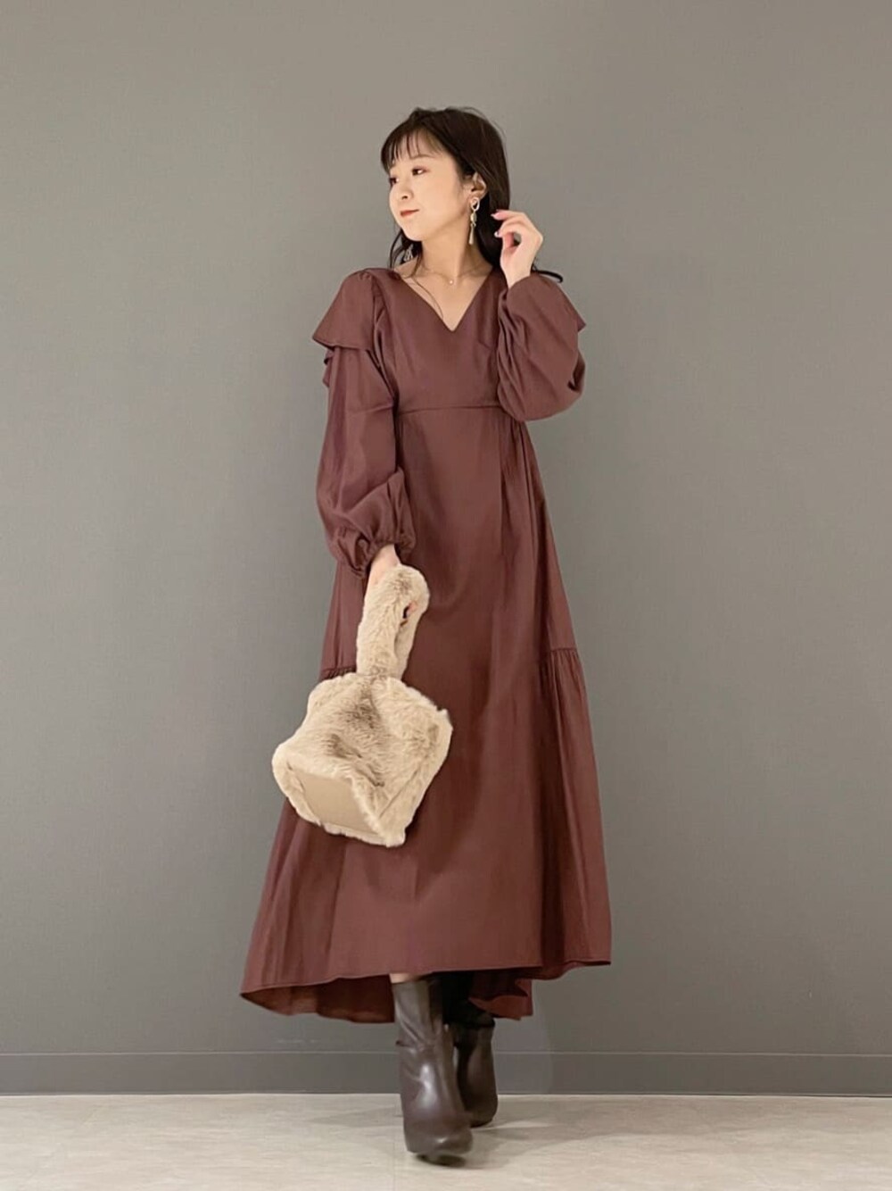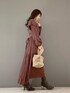 ワンピースはテロっとた柔らかい素材。胸切り替え、付属のリボンを結んでいただくとよりスタイルアップしてみえます。アウターはお家で洗えて暖かくて軽い万能ダウン!ボリュームがありますがショート丈なのでバランスが取りやすく低身長の方にもオススメのアウターです。