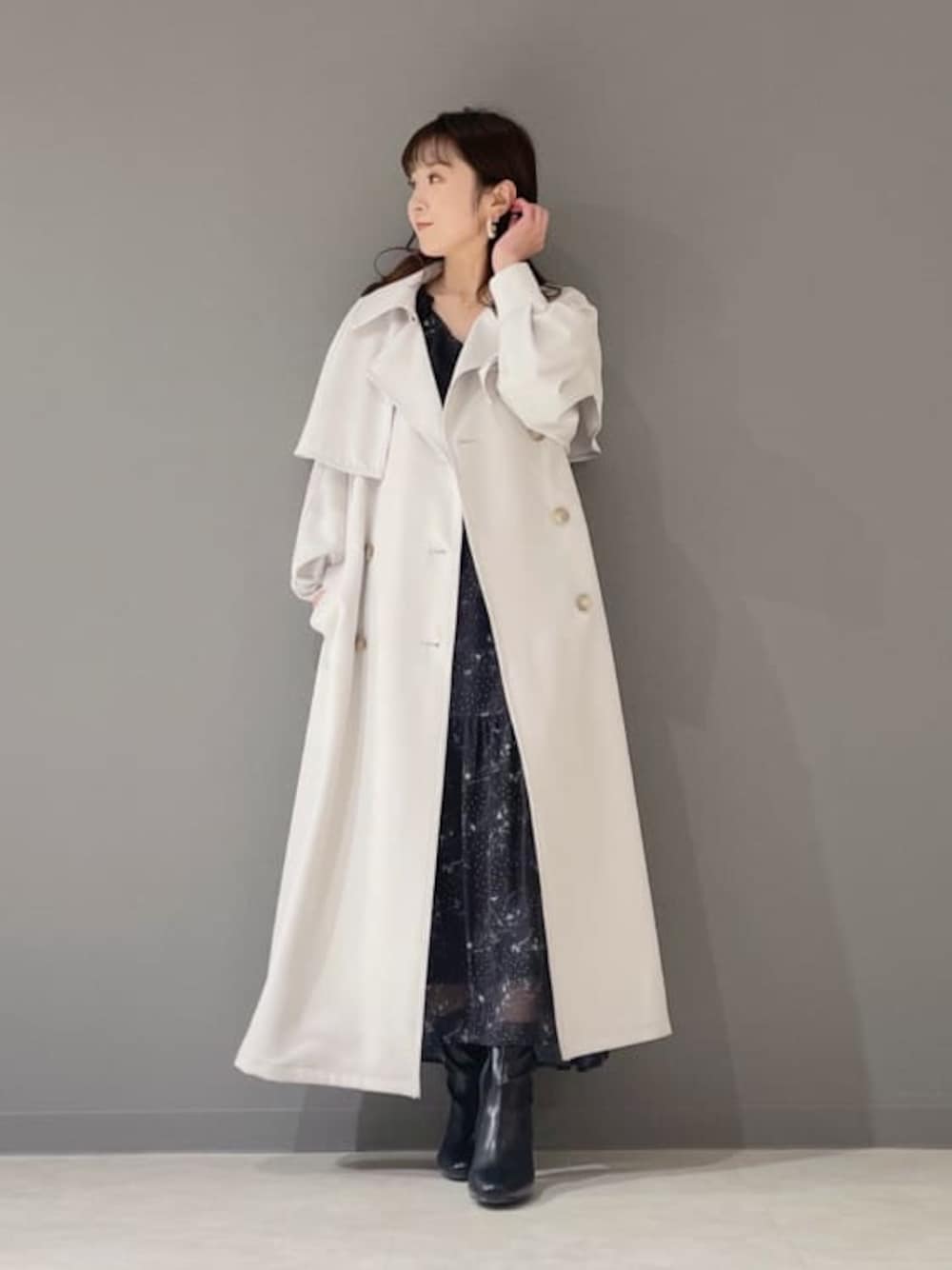 ワンピースはウエスト切り替えでペプラムデザインなのでスタイルがくびれて見えます!布帛ワンピなのでブラックでも重たく見えすぎません!身長151センチでSサイズ着用!くるぶし上くらいの丈感です!アウターはMサイズ着用。ゆったりシルエットが好きな方も袖をゆるっとフワッとまくって着ていただければ身長151センチの私も着れたので問題ないです!