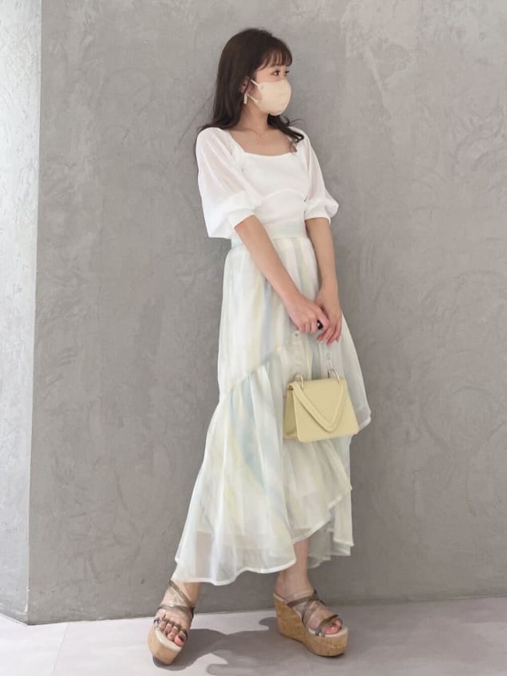 大人フェミニンな、初夏のお出かけコーデ♡(トップス)シアー素材のサラッとしたニットです。身ごろがビスチェ風のデザインなのでウエストラインはスッキリ見えます。(スカート)身長151センチSサイズ着用。足首がしっかり見える長さなのでフラットシューズ合わせでも◎ウエストは後ろ部分がゴムなので楽に履けます。(サンダル)23.5幅広ですが通常のサイズ感でちょうどよいです。ウェッジなので長時間履いても疲れにくいです!