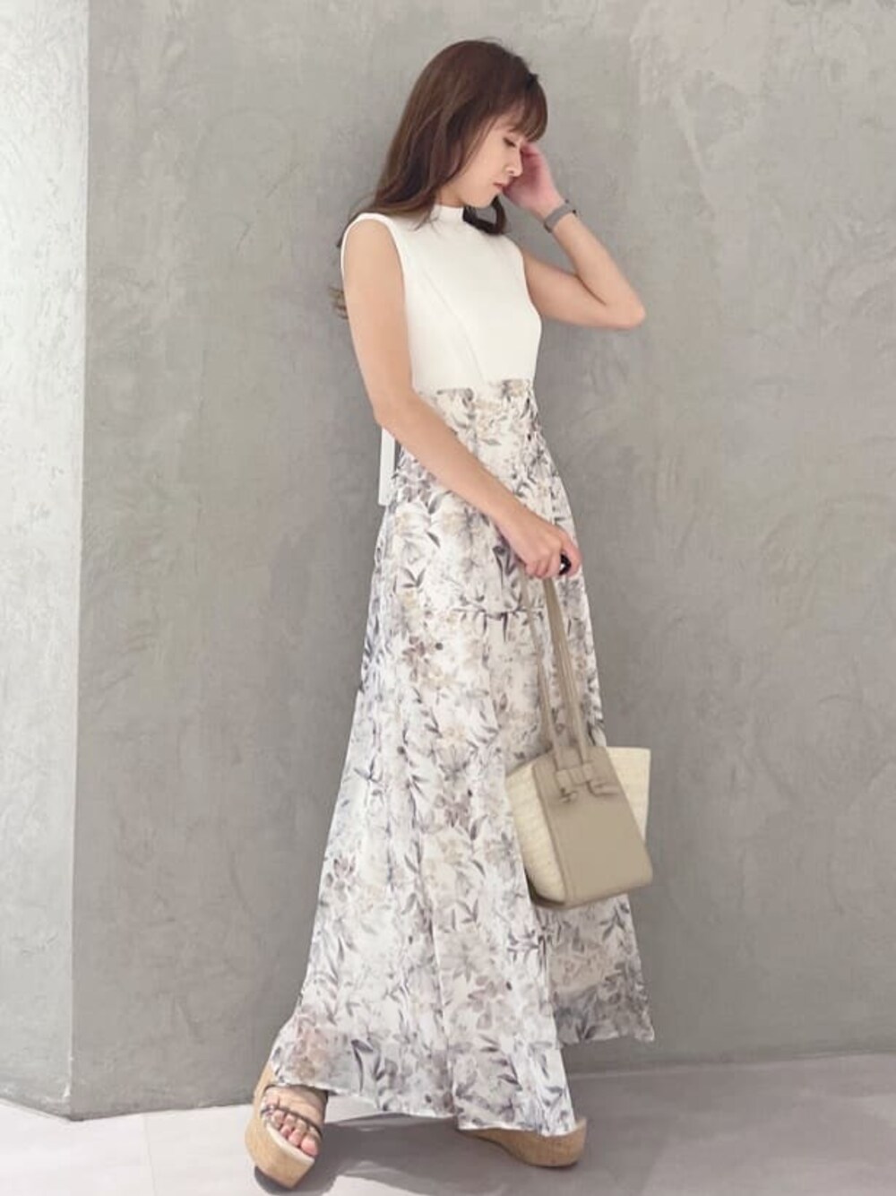一枚で決まる!大人フェミニンワンピース!(ワンピース)身長151センチMサイズ着用。足首下ぎりぎりの丈感なので小柄な方はヒール合わせがオススメです。ニット生地は薄手でサラッとした着心地で夏にオススメ!胸下切り替えなのでスタイルアップ見えする一枚です。フィット感S.M差はないです!