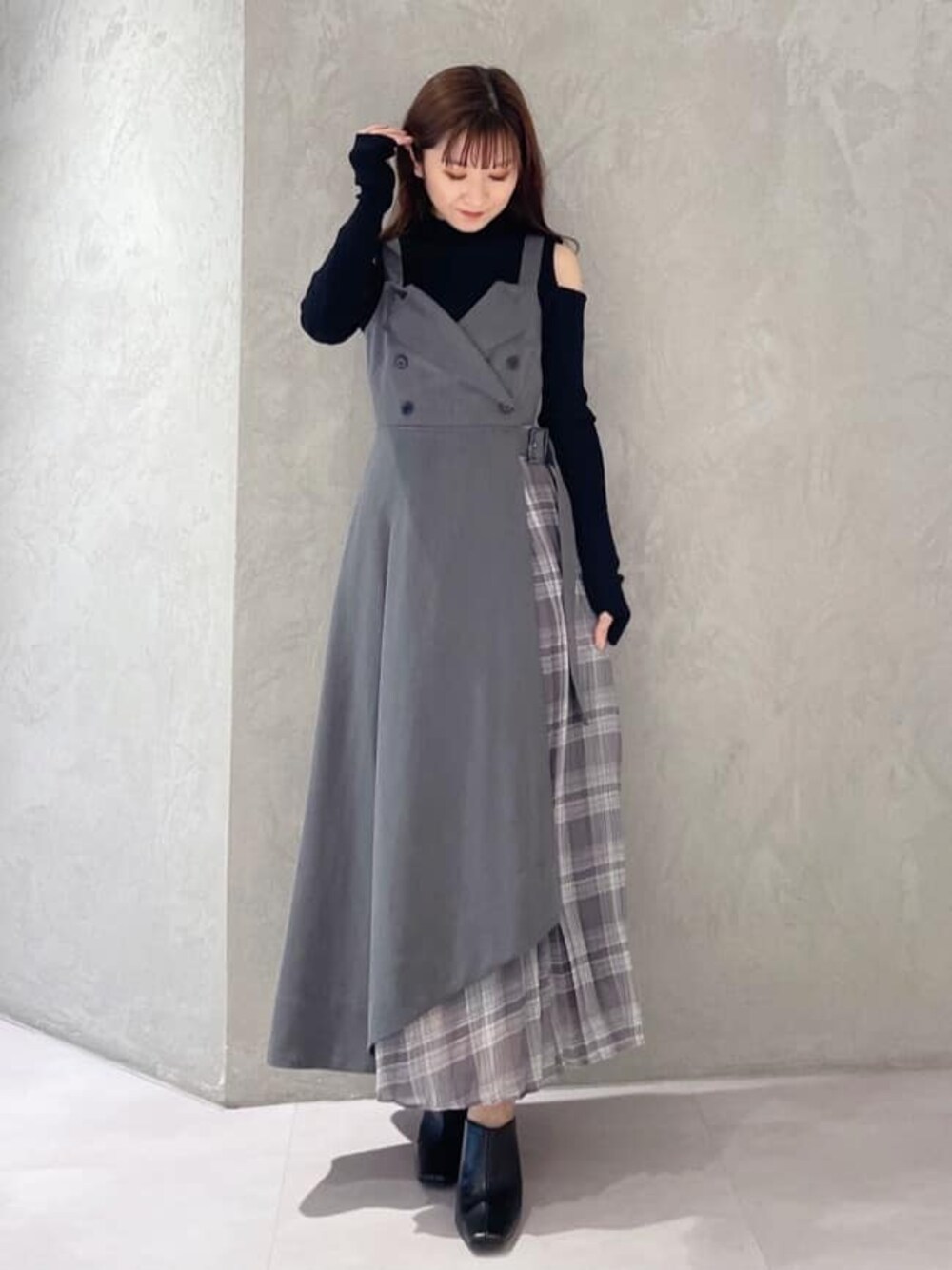 大人可愛いトレンドコーデ!(ワンピース)フリーサイズ展開。身長151センチ足首上の丈感です。肩紐のボタンで長さ調節可能です。(ニット)ボタンで取り外し可能なアームウォーマーニットは袖を外していただくとノースリーブになるのてシンプルにも着れます。
