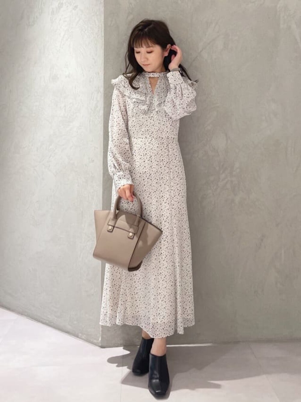 デートにおすすめ大人可愛い秋コーデ♡(ワンピース)身長151センチ足首上の丈感です。ダルメシアン柄のワンピースです。肩、胸にカットが入っていますがインナーが見えないくらいの開きです。胸下切り替えなのでスタイルアップみえする一枚です。