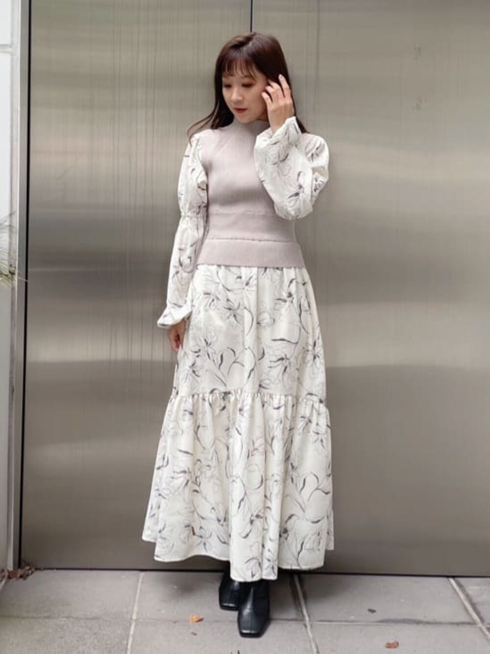 kaho (MERCURYDUO)のワンピース「フラワードッキングティアードニットワンピース」を使ったコーディネート