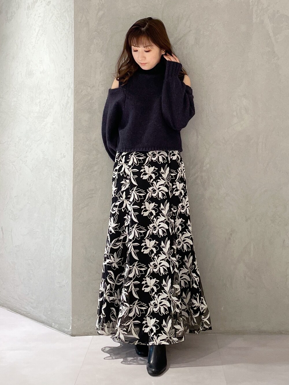 リール着用!冬の大人可愛いブラックコーデ♡(ニット)短丈なのでハイウエストボトムと合わせるとよりスタイルアップしてみえます!肉厚でふわふわして暖かいので肩空きですが冬まで着ていただけます。(スカート)身長151センチMサイズ着用。足首下の丈感です。チュールに柄が入っているので太陽光に当たるとキラキラしてより上品にみえます。