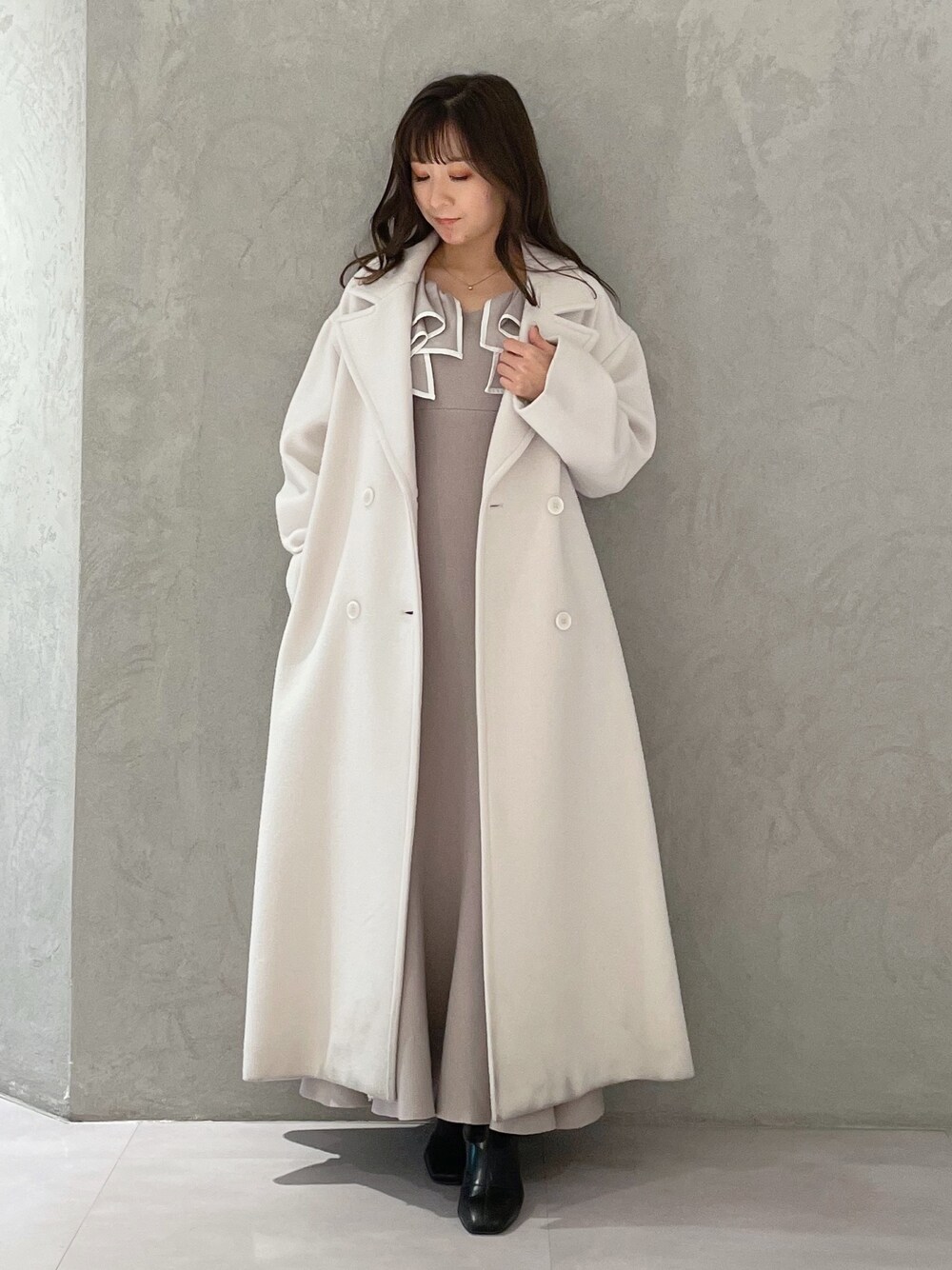 大人可愛い冬の淡色コーデ♡ (ワンピース)身長151センチMサイズ着用。足首下の丈感です。ハイゲージ素材のニット生地なのでボディラインを拾いにくいです!フリルの部分は異素材でシャリ感のある素材でハリがあります!配色カラーのフリルなので甘くなりすぎません!一枚でスタイルアップして見えるのでデートやお食事会にオススメです!(コート)身長151センチMサイズ着用。ドロップショルダーすぎないコートなので少しゆったり目に着たい方はMもオススメです!足首くらいの丈感でした。ロングコートですがものすごく軽く暖かかったです。