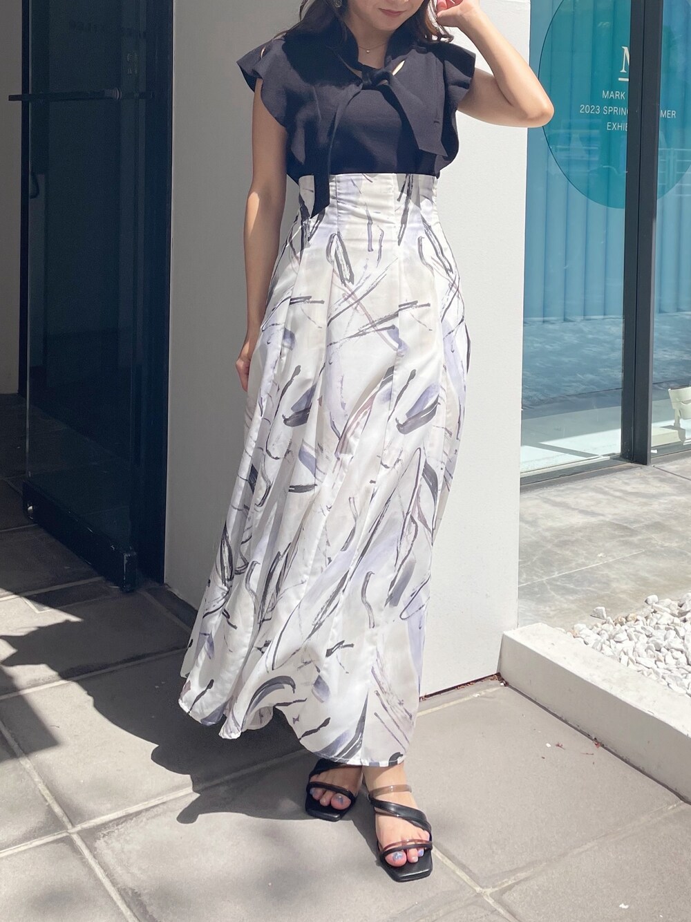 淡いトーンがフェミニンな夏のお出かけコーデ♡ (ニット)昨年大人気だったボウタイニットが今年も入荷♡今年のデザインは首元の開きをボウタイで調節できます!袖フリルデザインなので二の腕もスッキリキレイに見えますよ♡(スカート)身長151センチMサイズ着用。足首下の丈感です。 セミフレアのハイウエストデザインで腰回りにフィット感があるのでウエストラインがスッキリ見えます!(サンダル)足幅広目23.5センチ締め付け感なく楽に長時間履けました!