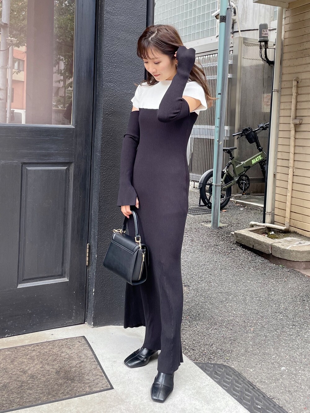 一枚でスタイルアップみえ❤️ リアバイ予定のおきにいりワンピース✨ *ワンピース 身長151センチMサイズ着用。足首ギリギリの丈感です。 タイトシルエットですが裾フレアなのでボディラインが綺麗に見えます!トレンドバイカラーデザイン、袖にカットも入ったオシャレなワンピースなので一枚でこなれて見えますよ♡秋はライダース合わせできても可愛いです❤️