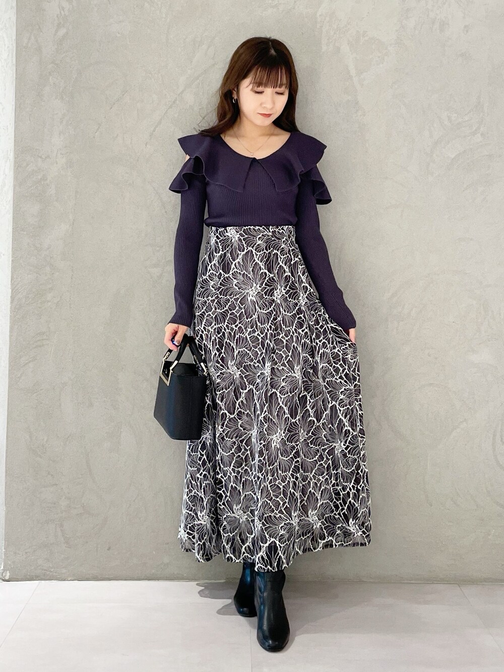 大人可愛いダークカラーコーデ❤️ *ニット 昨年大人気だったラッフルニットの肩あきバージョン!オフショルオンショル、前後2wayさまざまな着方ができます!リブニットデザインなのでピッタリとしたシルエットを活かしたトップスインで着ていたただくコーデがオススメ! *スカート 身長151センチMサイズ着用。足首下の丈感です。ハイウエストデザインなので脚長効果抜群!腰が広がらないセミフレアシルエットでスタイルキレイに見えます! *ブーツ 足幅広め23.5センチ36サイズで締め付け感なく楽に履けました。ヒールも太く安定感があるので一日履いても疲れません!