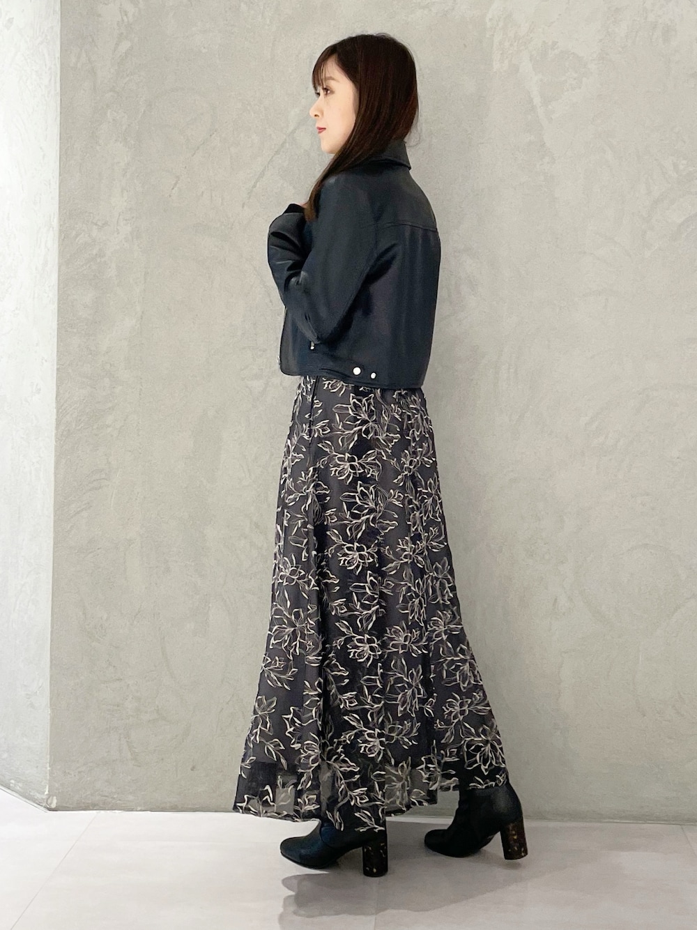 リール着用❤️ オールブラックコーデ✨ *ジャケット マーキュリー定番ジャケットは丈短めなのでハイウエストボトムとの相性抜群◎着るだけでスタイルアップして見えます!フェイクレザーなので柔らかい雰囲気のライダースジャケットです! *ニット 前後2wayで着ていただける細ストラップニットは柔らかいニット生地で着心地⭕️少し首元が開くのでインナーを着て合わせていただくのがおすすめです! *スカート 身長151センチSサイズ着用。足首上の丈感です。透け感のある大人っぽい雰囲気のスカートはキラっとした刺繍デザインがポイント!履くだけで華やかみえする一枚です! *ブーツ 足幅広め23.5センチ36サイズで締め付け感なく楽に履けました。ヒールも太く安定感があるので一日履いても疲れません!