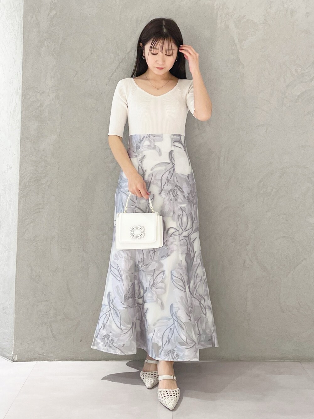 大人可愛いスタイルアップみえワンピ❤️ *ワンピース 身長151センチMサイズ着用。足首下の丈感です。胸下切り替えのワンピースなのでスタイルスッキリ見えるデザインです!スカート素材がしっかりとしたジャガード素材なのでボディラインを拾いづらいです!ジャケットを合わせてオフィススタイル風に着こなすのもオススメです!
