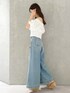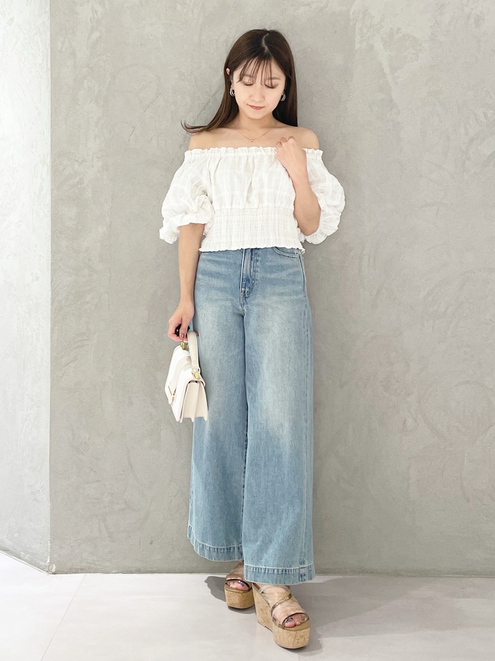 大人可愛いパンツコーデ❤️ *ブラウス 袖にボリュームがあるオフショルブラウス!丈は短めになっているのでお腹を出したくない方はハイウエストのボトムスと合わせるのがおすすめ! *デニム トレンドワイドデニムパンツ! 身長151センチSサイズ着用。足首くらいの丈感です。ハイウエストデザインで腰回りがスッキリ見えるのでラフに見えすぎません! ニットやブラウス合わせがオススメ♡ *シューズ 足幅広め23.5センチ36サイズでちょうどよく履けます。ヒールは高めですが傾斜が緩やかなので一日履いても疲れません!