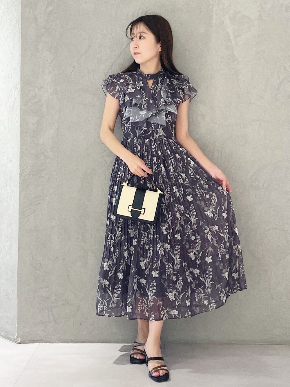 一枚でスタイルアップみえ! シックなデートコーデ❤️ *ワンピース 身長151センチSサイズ着用。足首上の丈感です。胸下切り替えのワンピースなのでスタイルがスッキリ見えます!肩のフリルは二の腕の太いところが隠れるくらいの長さです!シフォン素材で透け感があるのでダークカラーでも重たくならずに着れる一枚です!