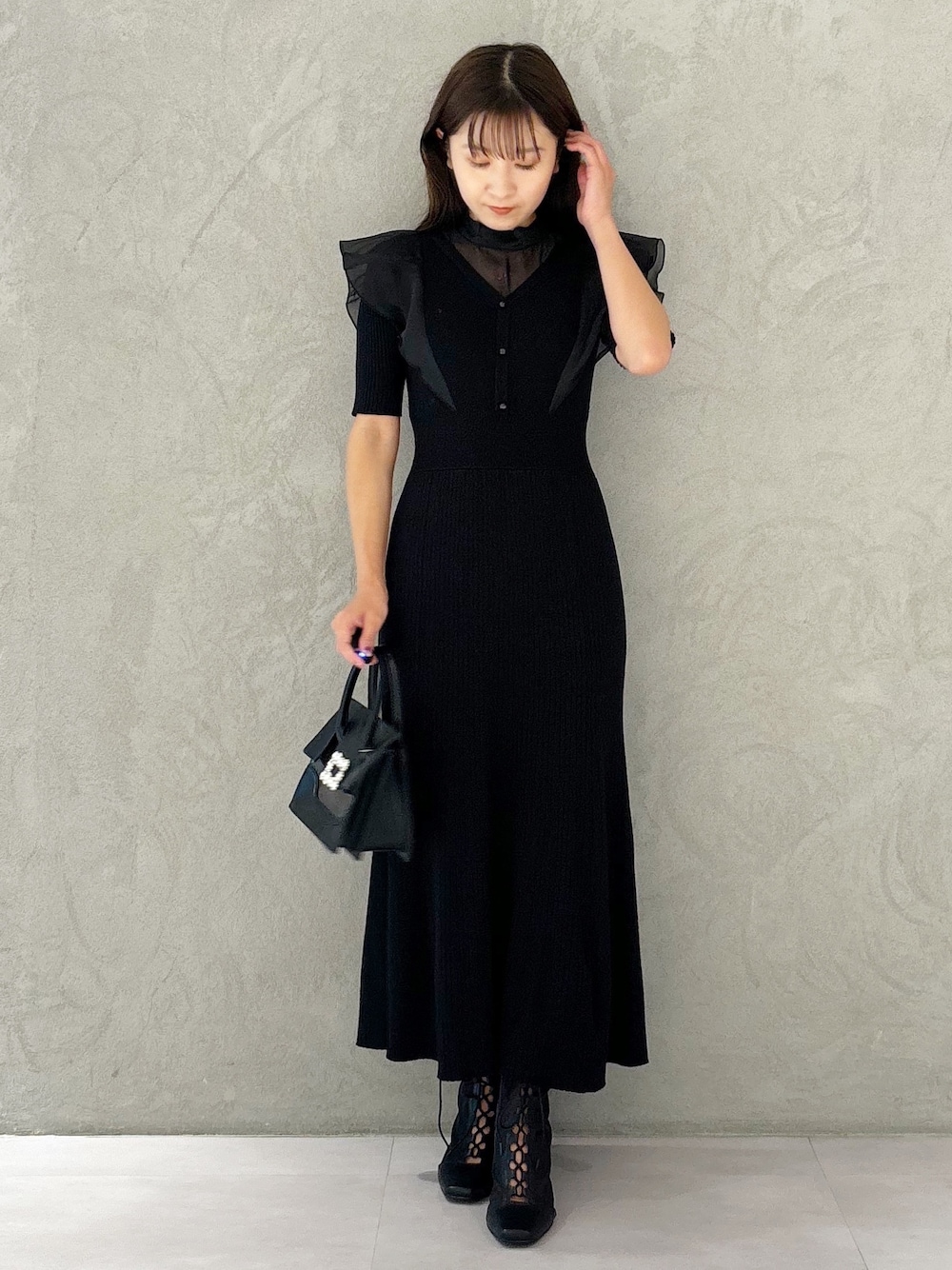 kaho (MERCURYDUO)のワンピース「2WAYオーガンジードッキングラッフルニットワンピース」を使ったコーディネート