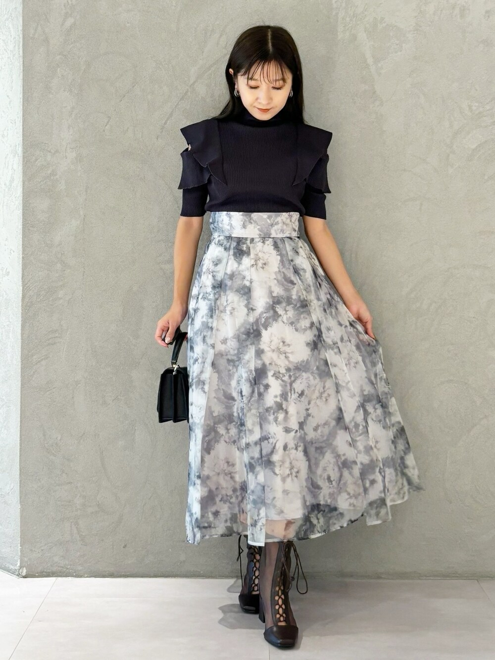 リール着用❤️ 大人可愛いダークカラーコーデ✨ *ニット 五分袖のラッフルニットは方にスリットが入っているのでチラッと肌見せで大人可愛いです✨ 変形リブで伸縮性もあるので着心地◎ *スカート 身長151センチMサイズ着用。足首上の丈感です。たっぷりとしたフレアデザインなのでふわっと上品見えします!ペイントフラワー柄なので甘く見えすぎず大人っぽか見える一枚です。