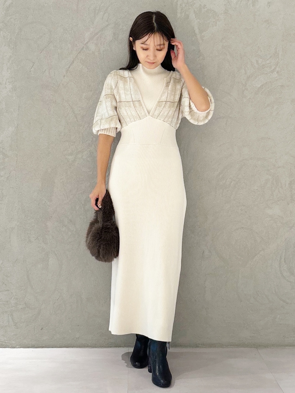 kaho (MERCURYDUO)のワンピース「チェックジャカードドッキングニットワンピース」を使ったコーディネート