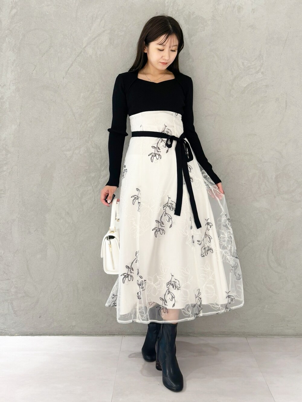 kaho (MERCURYDUO)のワンピース「エンブロイダリーニットドッキングワンピース」を使ったコーディネート