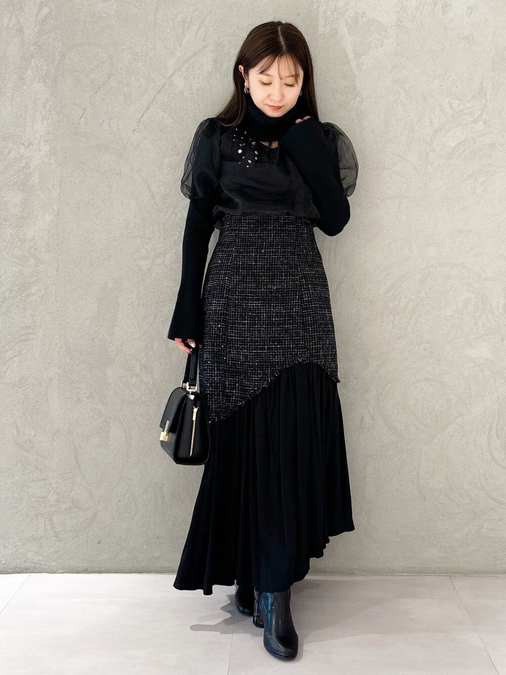 大人可愛いオールブラックコーデ❤️ *ニット 袖にボリュームがあるデザインですが袖周りがピタッとリブ生地なのでバランスよくスッキリ着こなせます!ボトムスはタイトなデザインで合わせるのが◎ *スカート 身長151センチMサイズ着用。足首下の丈感です。裾が異素材生地なので動くとヒラヒラ揺れ上品見えします! *シューズ 足幅広め23.5センチ36サイズで締め付け感なく楽に履けました!ヒールが太いので1日履いても痛くならずに履けました!