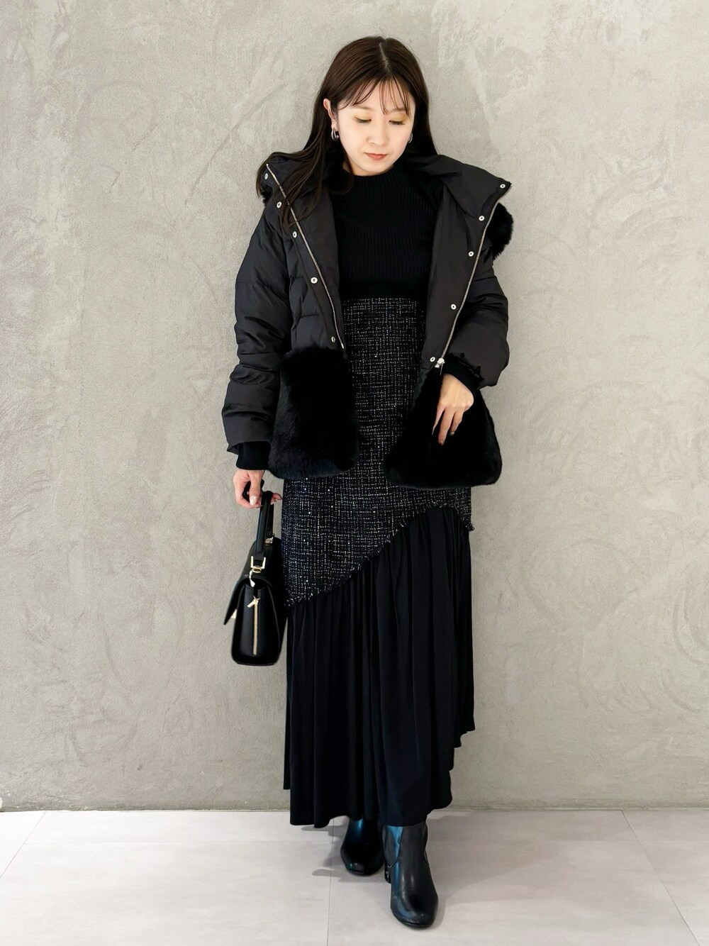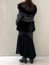 大人可愛いオールブラックコーデ🖤 *アウター 身長151センチMサイズ着用。腰下くらいの丈感。袖もちょうど良く着れました。ウエストがシェイプされたデザインなのでジップを閉めて着るとウエストがくびれて見えます!袖もリブ付きなので風も入りにくいデザインです!腰回りにファーがついたアウターなので羽織るとおしゃれ見えします! *スカート 身長151センチMサイズ着用。足首下の丈感です。裾が異素材生地なので動くとヒラヒラ揺れ上品見えします! *ニット 昨年も大人気パールニット!袖フレアでパールが付いているので動いた時に手首が華やか見えします! 変形リブでとても着やすいです! *シューズ 足幅広め23.5センチ36サイズで締め付け感なく楽に履けました!ヒールが太いので1日履いても痛くならずに履けました!
