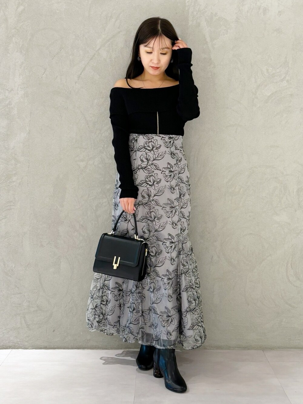 この冬のデートに着たい❤️ 大人可愛いブラックコーデ✨ *ニット 人気のジップニットの長袖バージョンです!変形リブで伸縮性◎イン、アウトでも着ていただけるニットです! *スカート 身長151センチMサイズ着用。チュール素材のマーメイドスカートはウエストがバックレースアップデザインで絞れるのキュッときれいに着こなせます!繊細な花柄デザインで大人っぽい雰囲気です。 *シューズ 足幅広め23.5センチですが締め付け感なく楽に履けました!