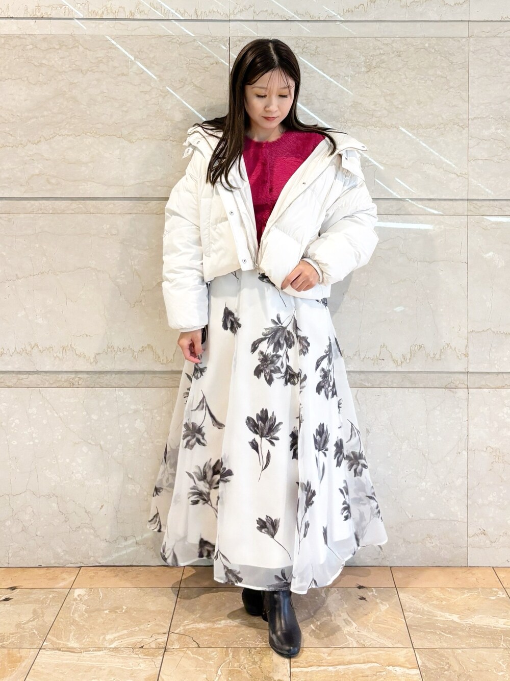 リール着用❤️ 大人可愛いクリスマスコーデ✨ *ニット 毎年定番のシャギーニットカーディガンが今年も登場!今年はカラバリがリニューアル!短丈なのでハイウェストボトムとの相性◎羽織としても着ていただける万能アイテムです! *スカート 身長151センチMサイズ着用。毎年大人気のフロッキースカートはセミフレアデザインなのでウエストスッキリスタイルアップして見えるスカートです!花柄が大きめなので一枚で上品にみえます! *ダウン 身長151センチSサイズ着用。腰上くらいの丈感です。アライドダウンを使用した軽くて暖かいアウターです。フードは取り外し可能なので首元のボリュームをダウンさせて着ることもできます! *シューズ 足幅広め23.5センチですが締め付け感なく楽に履けました!