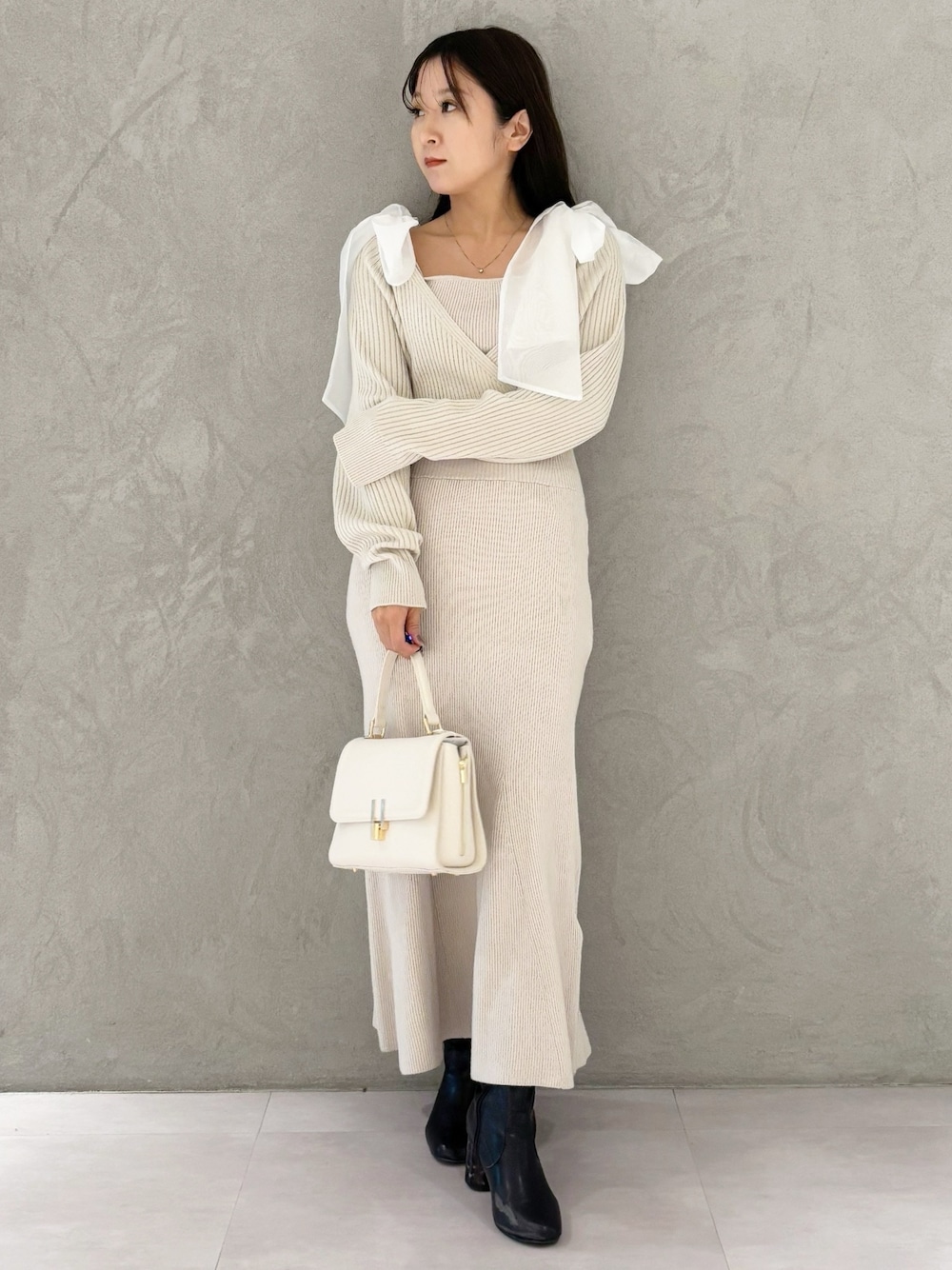大人かわいいモテコーデ✨ *ワンピース 身長151センチMサイズ着用。足首くらいの丈感です。少し厚手のリブ生地の大人気のリボンワンピース‼️スカートはマーメイドスカートなのでウエストラインがキュッとすっきり見えします! *シューズ 足幅広め23.5センチ36サイズで締め付け感なく楽に履けました!ヒールが太いので1日履いても痛くならずに履けました!