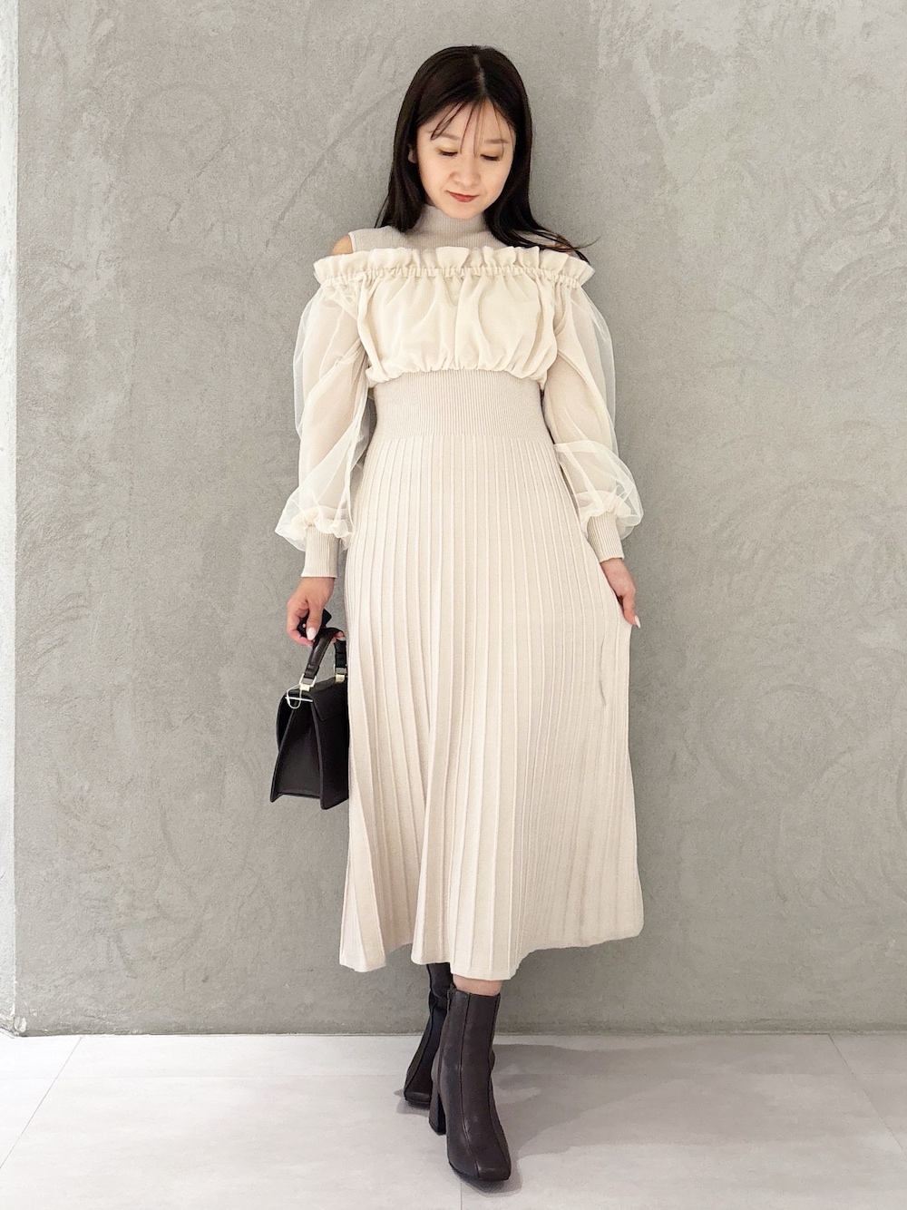 kaho (MERCURYDUO)のワンピース「異素材チュールドッキングオフショルニットワンピース」を使ったコーディネート