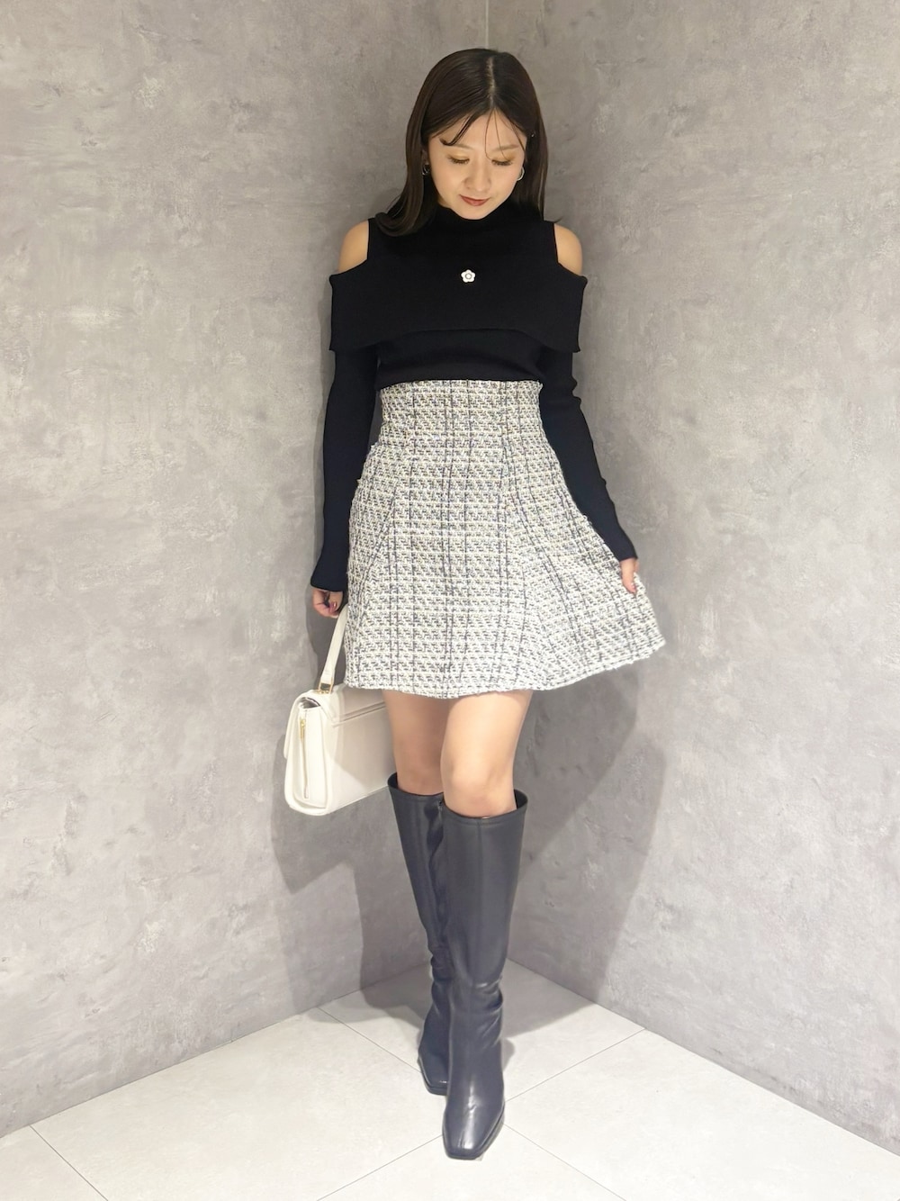 大人かわいいミニ丈デートコーデ❤️ *ニット 肩開きのあざと可愛いモテニットはぴったりリブデザインで着心地◎ *スカート バックレースアップデザインなのでウエスト調節可能!キラキラしたツイードデザインで一枚で華やか見えします!フレアデザインなので脚のラインもすっきり見え、インナーパンツ付きでとても履きやすいです!