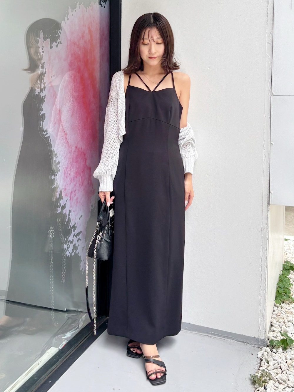 大人カジュアルなブラックコーデ❤️ *カーデ 昨年人気だった透かしカーディガンは柔らかくさらっときやすさ抜群!短丈なのでスタイルアップみえも! *ワンピース キャミソールワンピースなので中にニットを合わせたり一枚でシャツを合わせたりと着回し抜群です!