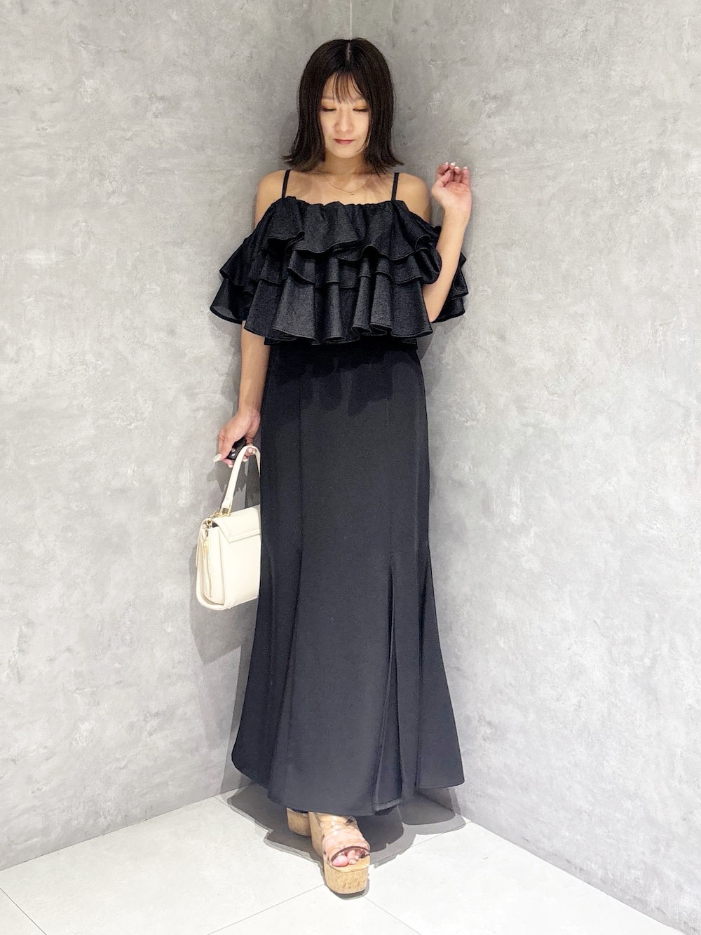 大人かわいいオールブラックコーデ❤️ *トップス 前後2wayデザインのブラウスです! 肩がしっかりと下がったオフショルです。 *スカート 店舗大人気スカート予約開始✨身長151センチSサイズ着用。足首上の丈感です。レースアップデザインなのでウエストの調節が可能◎ウエスト周りのフィット感がピッタリしているのでくびれがキレイに見えるスカートです! *シューズ 足幅広め23.5センチ。締め付け感なく楽に履けます。ヒールは高いですが傾斜が緩やかなので長時間はいても疲れません!