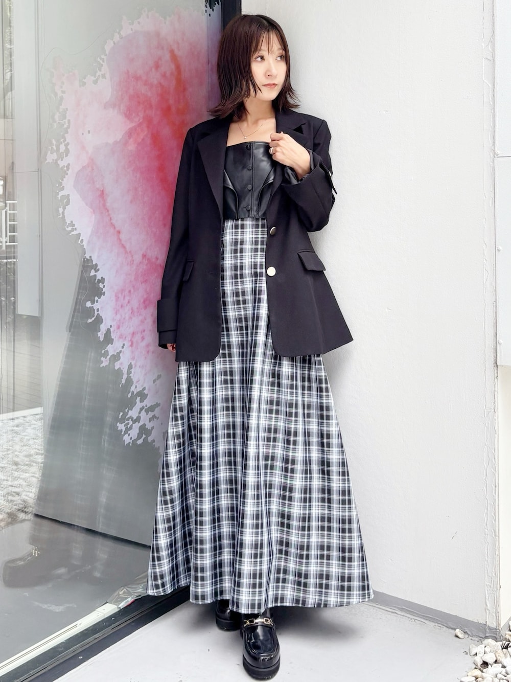 秋のオススメブラックコーデ✨ *ジャケット ウエストがシェイプされたジャケットなので羽織るだけでスタイルアップ見えします! *ワンピース キャミソールデザインのワンピースなので中にニットをレイヤードして着こなしても◎ビスチェデザインなのでウエストラインがキュッとしまって見えます! *シューズ 足幅広め23.5センチ締め付け感なく楽に履けました。