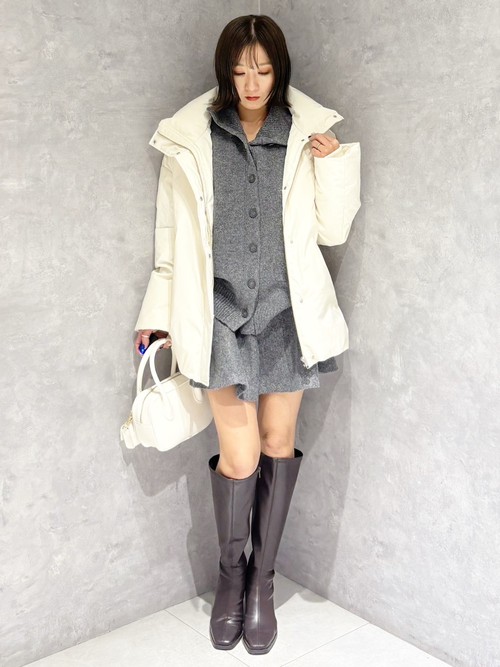 大人可愛いミニ丈コーデ🩷 *アウター ミディ丈ダウンはアライドダウンなので軽くて暖かくおすすめです! *セットアップ ニットスカートセットのアイテム!シンプルデザインなので別々でも着回し可能! 肉厚のモチッとした柔らかいニットなので着心地◎ *シューズ フィット感のあるロングブーツで足のラインが綺麗に見えます!