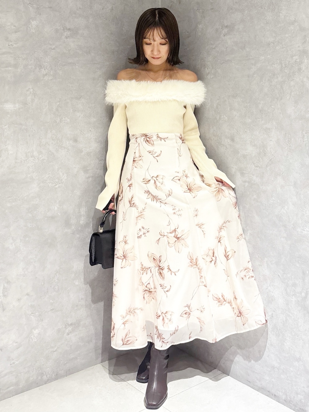 kaho (MERCURYDUO)のワンピース「花柄オフショルニットドッキングワンピース」を使ったコーディネート