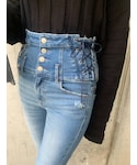 今季イチオシのデニムでコーディネートを組んでみました☺︎❤︎ ウエスト部分にあしらわれたレースアップデザインが目を惹くのは勿論、切り替えが斜めに入っている事でウエストがくびれて見え、着痩せ効果バツグンです◎ また、レースアップは調節可能なので程良く自分のウエストに合わせて着用頂けます♪ 一緒に合わせたニットは袖のたぽっとしたシルエットが女性らしくて可愛いデザイン! 編地に立体感のあるデザインなのでアウターのインナーとしても、春先には一枚で着用でも主役になってくれます☺︎ 首元広めなデザインでデコルテをキレイに魅せてくれるので、顔周りがスッキリとした印象になるのも嬉しいポイント♫ 襟シャツなどとのレイヤードや、肩を少し落としてワンショルダーでの着用もオススメなので是非チェックしてみて下さい❤︎
