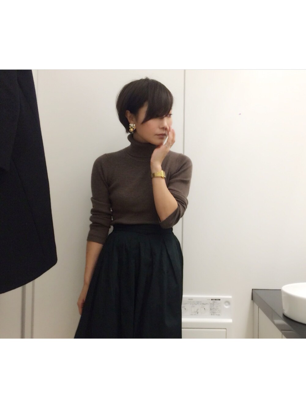 ブラウン系のニット/セーターを着用したレディースの冬コーディネートの1枚目の写真