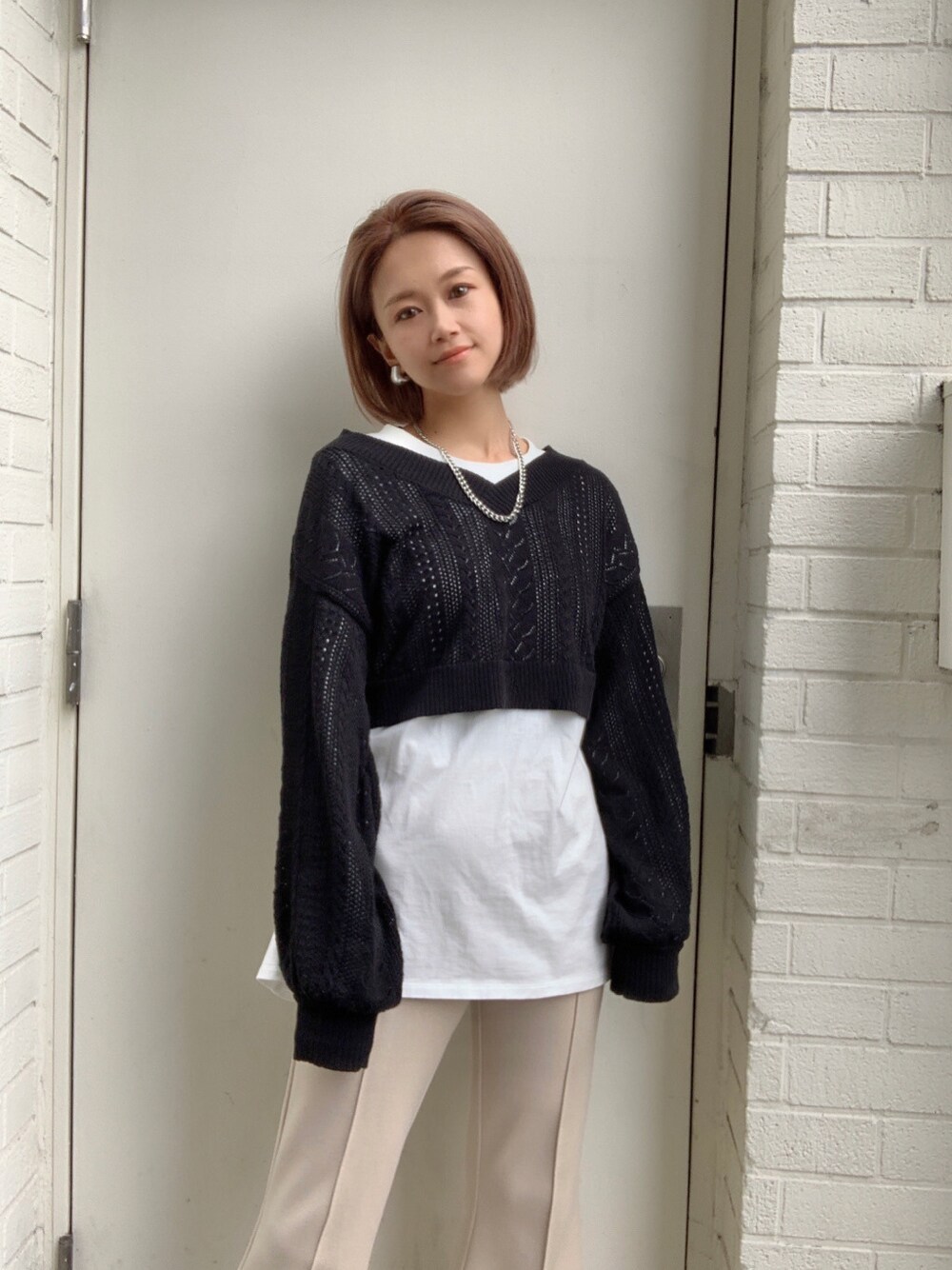 トップスはなんとショートニットとロンTがセット⭐︎ ショートニットは涼しげなシアーデザイン。 ロンTはお尻が隠れる着丈で、メリハリのあるコーデが作れます! スタイルが良く見える黄金比♡♡ ボトムはホワイトで春らしく抜け感を意識してみました。 ボトムもとってもオススメで、ジャージ素材で履き心地抜群。センタープレスが入っているのできちん感も出ますよ♪