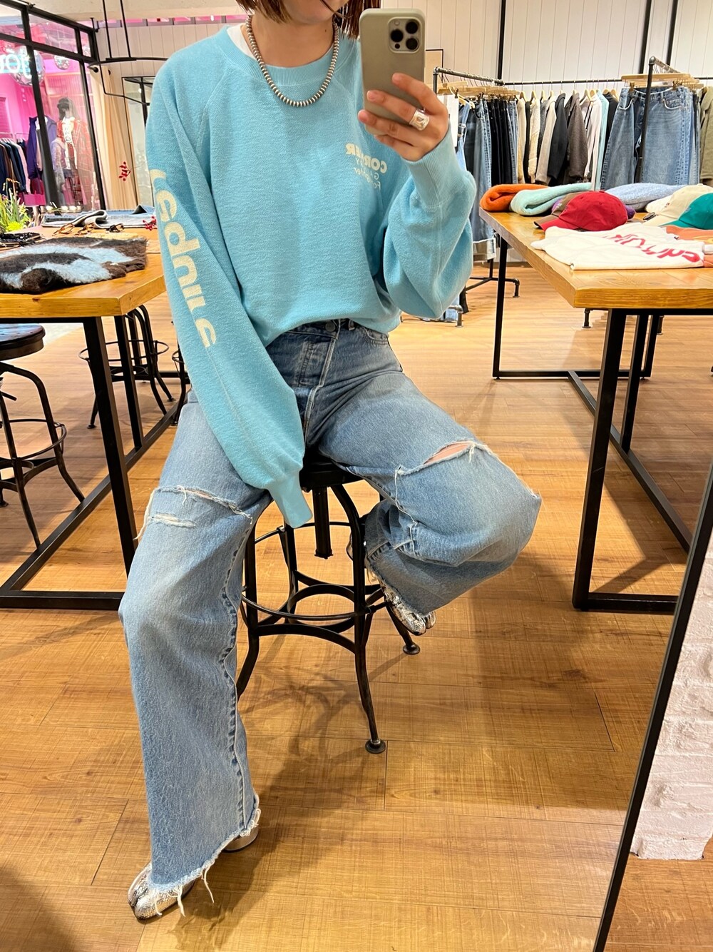 カラーが鮮やかなロゴスウェットと ダメージデニムで カジュアルコーデ👖