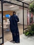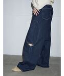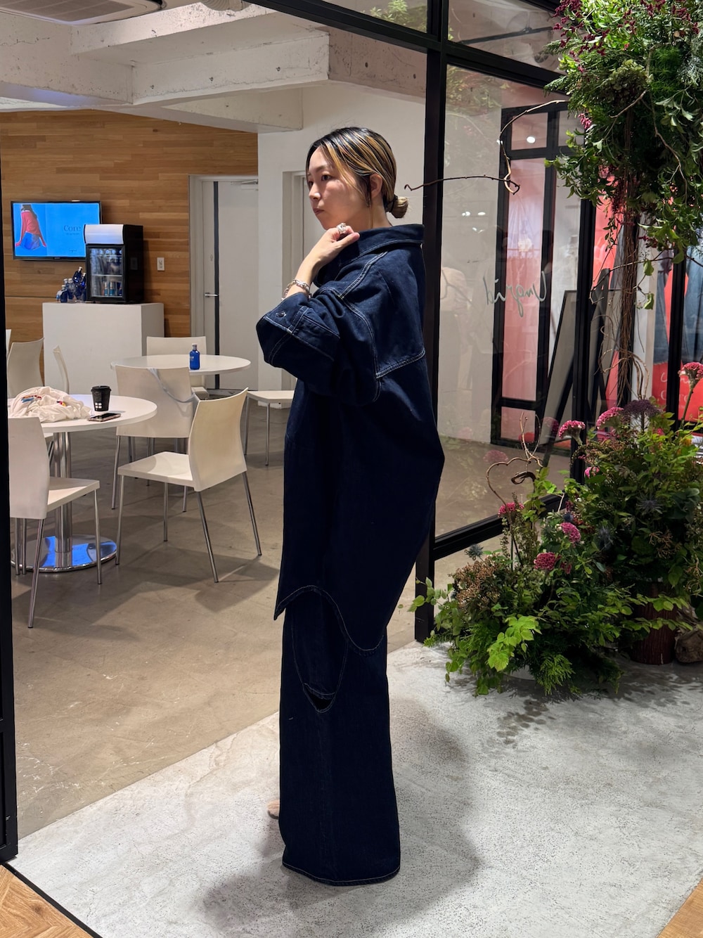 ビッグサイジングのデニムシャツとカッティングが効いたデニムパンツのセットアップコーデ。 立体的なシルエットでシャツは抜け感を意識してボタンを外したりしてバランスを取るのがオススメです。